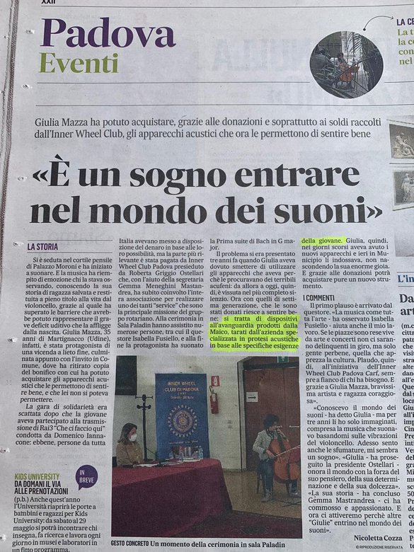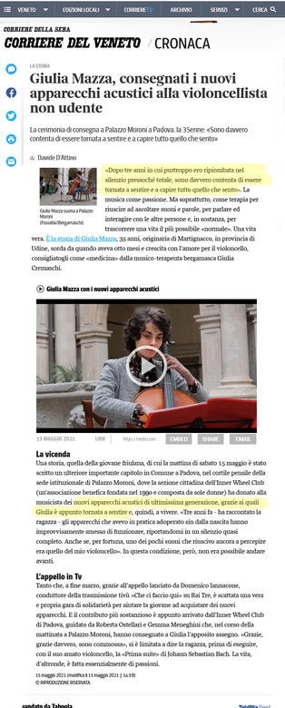 Giulia Mazza, la violoncellista friulana sorda dalla nascita, potrà continuare a suonare il suo amato violino grazie alla solidarietà e alle competenze messe in campo per aiutarla. Giulia ha bisogno di un apparecchio acustico di ultima generazione e lo potrà indossare con l’aiuto dell’Inner Wheel Club Padova Car…