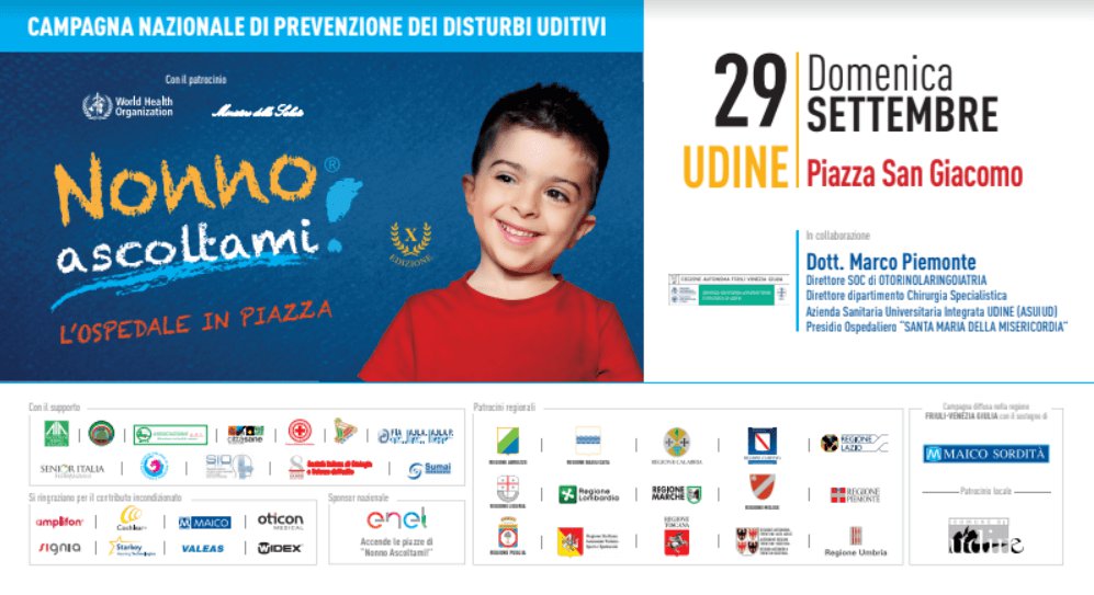 L’OSPEDALE SCENDE IN PIAZZA PER L’UDITO DOMENICA IL SORDO PRIDE DAY Ritorna a Udine “Nonno Ascoltami, la campagna di prevenzione per l’udito” E’ giunta ormai alla decima edizione la campagna nazionale di screening gratuiti dell’udito “Nonno Ascoltami! – L’Ospedale in Piazza”, che farà tappa anche a Udine. L’evento, patrocinato dalla Presidenza del Consiglio e dal Ministero della Salute, che ogni anno porta in piazza il suo messaggio di prevenzione sull’udito, arriva nel capoluogo friulano domenica 29 settembre in Piazza San Giacomo dalle 8 alle alle 19. Un’intera giornata dedicata alla prevenzione e rivolta alla cittadinanza, soprattutto alla fascia più anziana della popolazione. Anche Udine ospita questa importante iniziativa che punta l’attenzione a un problema quello uditivo, spesso sottovalutato ma che può essere altamente invalidante, soprattutto dal punto di vista della socialità perchè non sentire porta all’isolamento. Da qui l’importanza di sensibilizzare la cittadinanza e, soprattutto, di fare prevenzione ed è questo l’obiettivo di “Nonno ascoltami”. Nel salotto buono della città, per tutto il giorno, saranno presenti gli otorinolaringoiatri dell’Azienda sanitaria universitaria integrata di Udine con il direttore della Soc di otorinolaringoiatria, il dottor Marco Piemonte a coadiuvare le prove dell’udito gratuite effettuate dagli audioprotesisti messi a disposizione da Maico, partner tecnico dell’iniziativa. “La sordità ha un’incidenza di oltre il 12% nel nostro Paese - spiega Corrado Canovi, segretario dell’associazione europea audioprotesisti - c’è la necessità di ridurre l’impatto della sordità che, oltre a causare disturbi di carattere sociale, crea alterazioni del tratto el comportamento e dell’ansia. Quindi è necessario procedere con una forte campagna di sensibilizzazione e prevenzione. Nonno ascoltami nasce dalla consapevolezza del mondo del deficit uditivo. Portare in piazza il controllo dell’udito - aggiunge - serve proprio per seguire quella politica che è l’emersione del problema e della naturalezza della soluzione. A volte la risposta allo stigma è l’apertura in piazza: un sordo pride”.